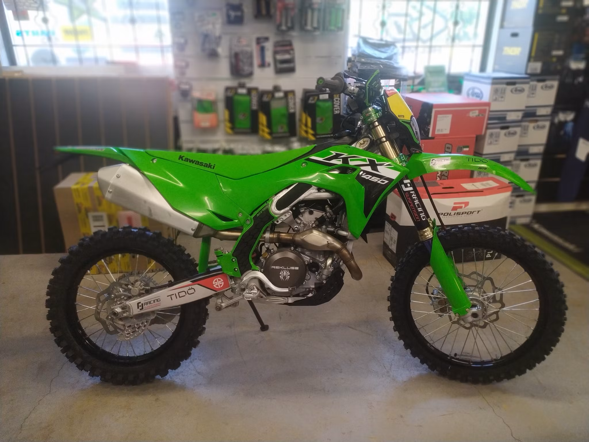 KX 450 2024 Enduro modifierad med Fram lyse Baklampa stöd . Rekluse halv automat koppling . Xtrig krona Xtrig pdhs Part by sweden fotpinnar Dpa kedjestyrare Showa rainbow Gaffel modifierad av FJ Racing för 95 kg.