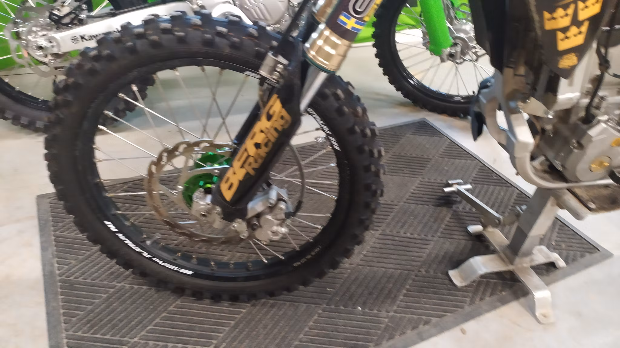 På crossen sitter det Öhlins stötdämpare Akrapovic hel avgassystem samt SM Pro hjul